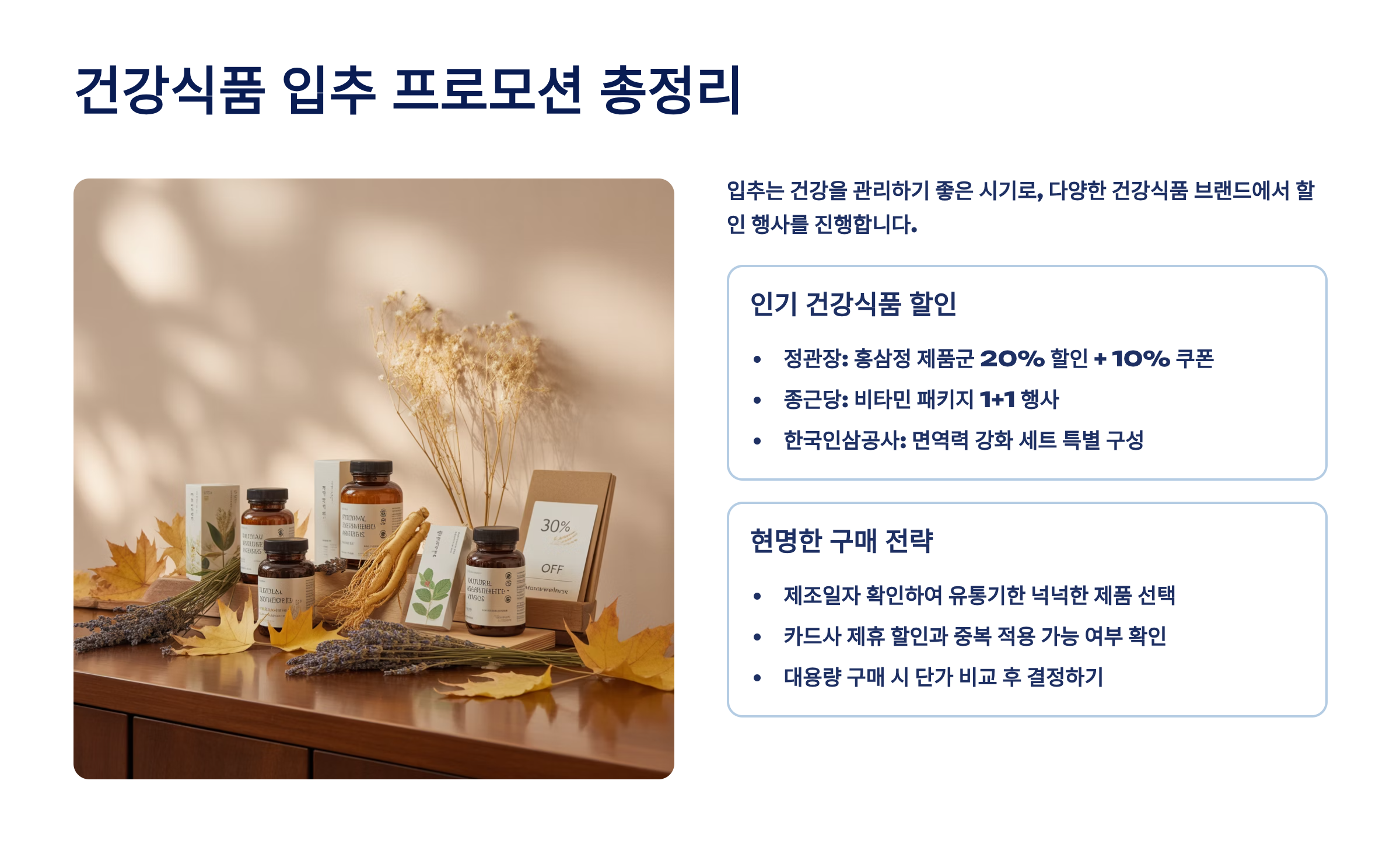 입추는 계절이 바뀌는 시기인 만큼 건강 관리가 특히 중요해요. 이때를 맞아 주요 온라인 쇼핑몰과 건강식품 브랜드들이 대규모 할인 행사를 진행하고 있답니다. 쿠팡에서는 8,000여 개의 건강식품을 최대 50% 할인하는 행사를 7월 31일부터 8월 3일까지 진행해요. 홍삼, 프로틴, 비타민, 견과류 등 다양한 제품을 저렴하게 구매할 수 있는 기회예요!