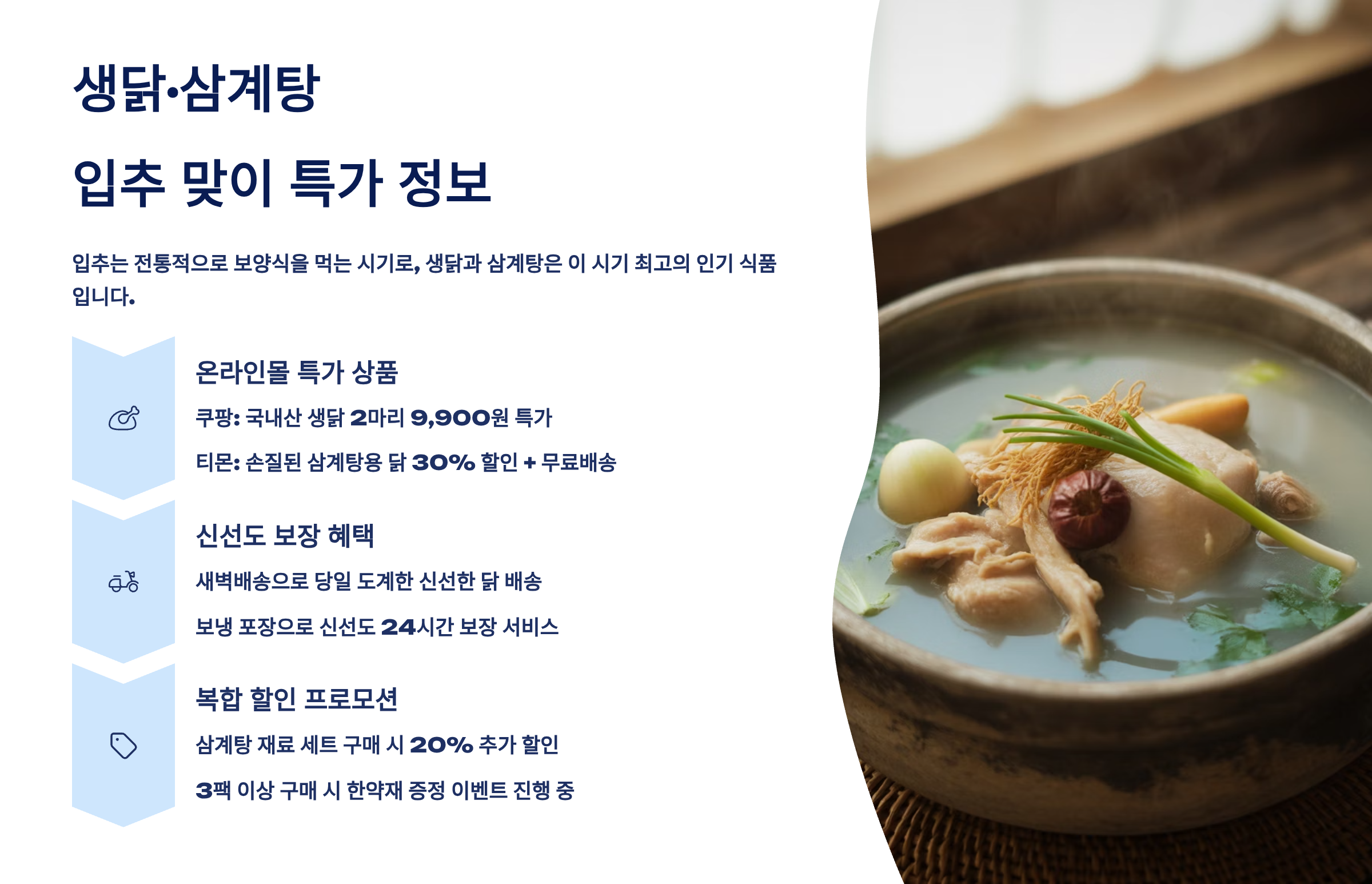 입추와 말복이 겹치는 시기는 전통적으로 보양식을 챙기는 때예요. 특히 삼계탕은 더위에 지친 몸을 보양하는 대표 음식으로 사랑받고 있죠. 2025년 입추를 맞아 대형 할인점과 온라인몰에서는 생닭과 삼계탕 재료를 파격적인 가격에 판매하고 있어요. 지역별 신선육 생닭(1~1.1kg)이 5,980원부터 9,900원에 판매되고 있으며, 복날 기간에는 15~30% 할인 행사가 진행된답니다.