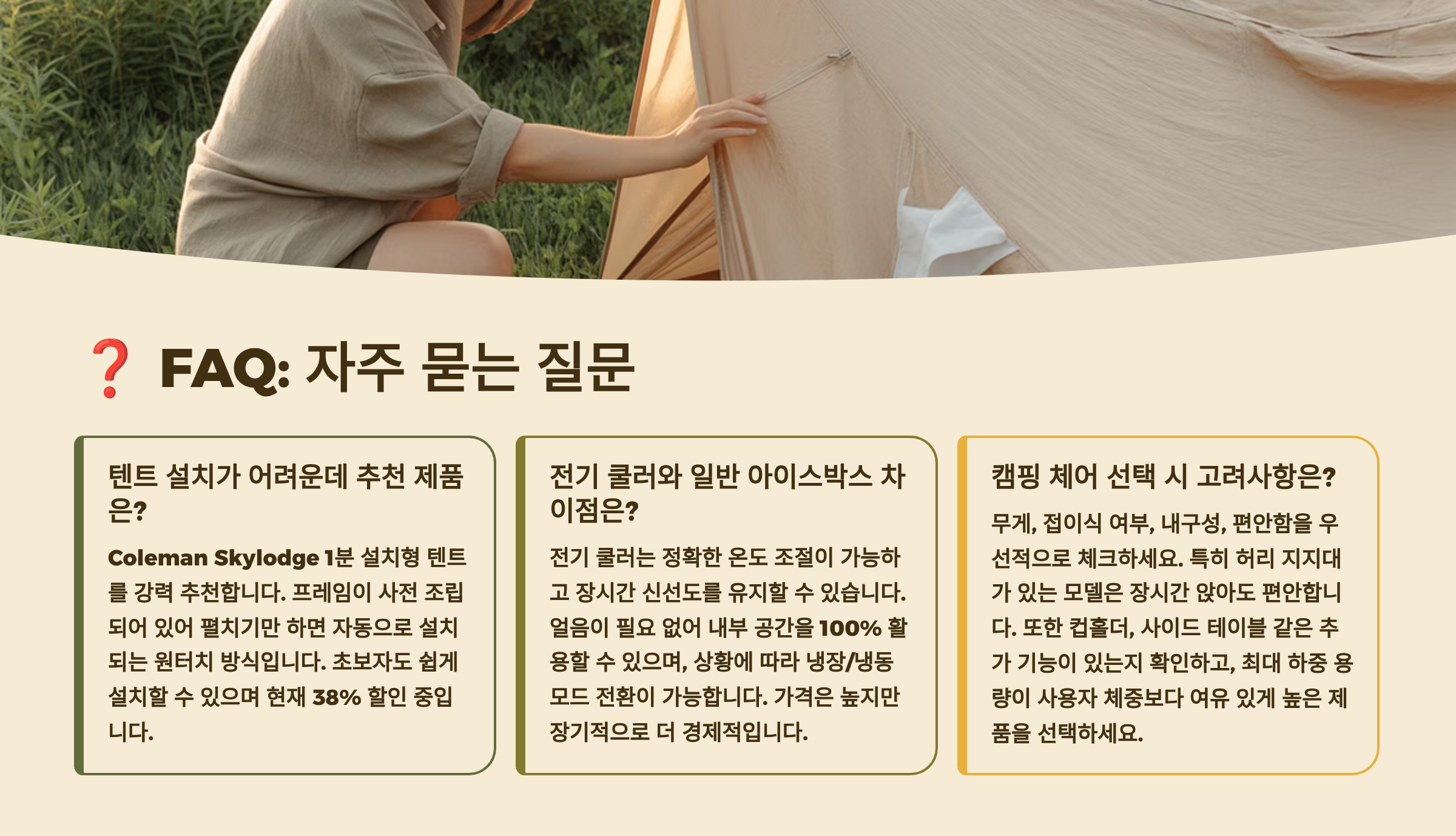 | 하드쿨러 | 보냉력 우수, 내구성 강함 | 무겁고 부피가 큼 | 장기 캠핑 |