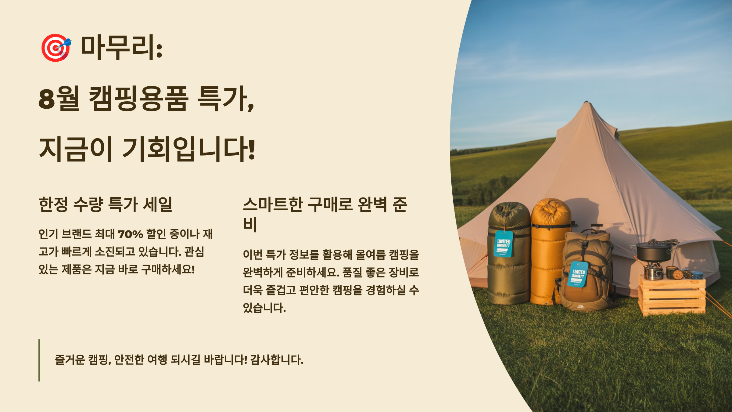 마지막으로 안전한 캠핑을 위해 꼭 기억해주세요. 아무리 좋은 장비를 갖추었더라도 안전 수칙을 지키지 않으면 위험할 수 있어요. 날씨 확인, 캠핑장 규칙 준수, 화기 취급 주의 등 기본적인 안전 수칙을 꼭 지켜주세요. 그리고 자연을 아끼는 마음으로 흔적 없는 캠핑을 실천해주시면 더욱 좋겠어요. 이번 8월, 특가로 장만한 캠핑 장비와 함께 멋진 추억 만드시길 바랍니다! 해피 캠핑! 🏕️✨