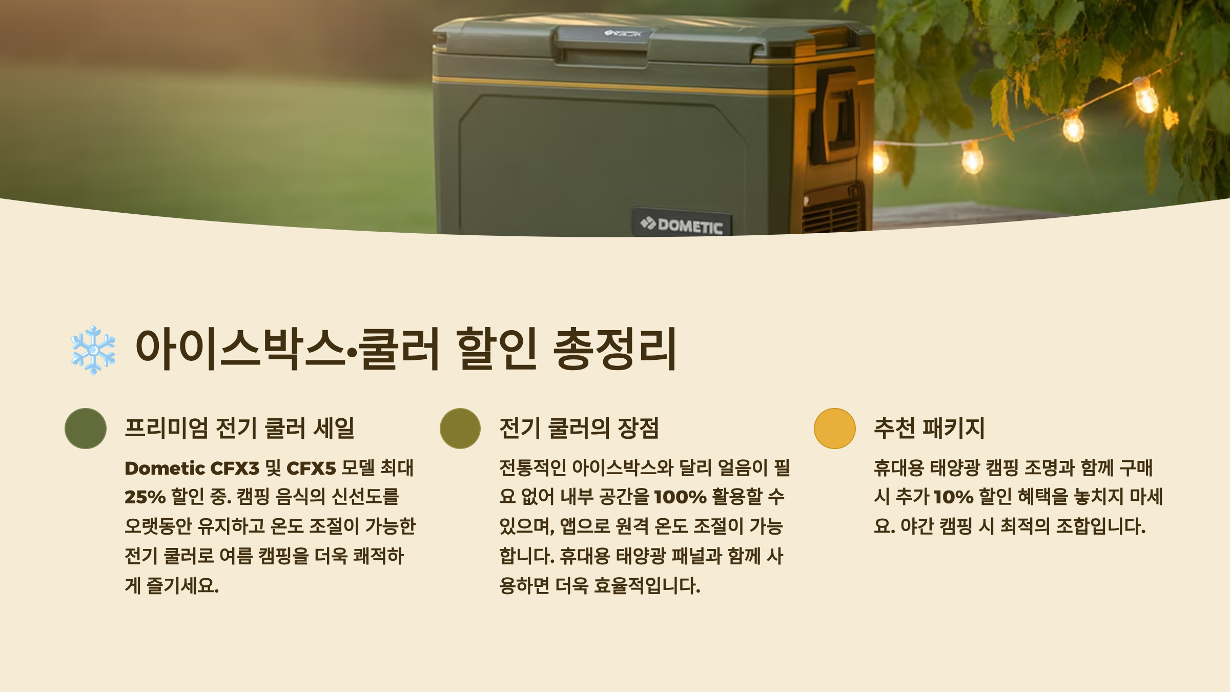 나의 생각으로는 쿨러는 캠핑의 만족도를 크게 좌우하는 장비예요. 시원한 음료와 신선한 식재료를 유지할 수 있다면 캠핑의 즐거움이 배가 되거든요. 이번 8월 특가를 활용해서 품질 좋은 쿨러를 저렴하게 구매해보세요!