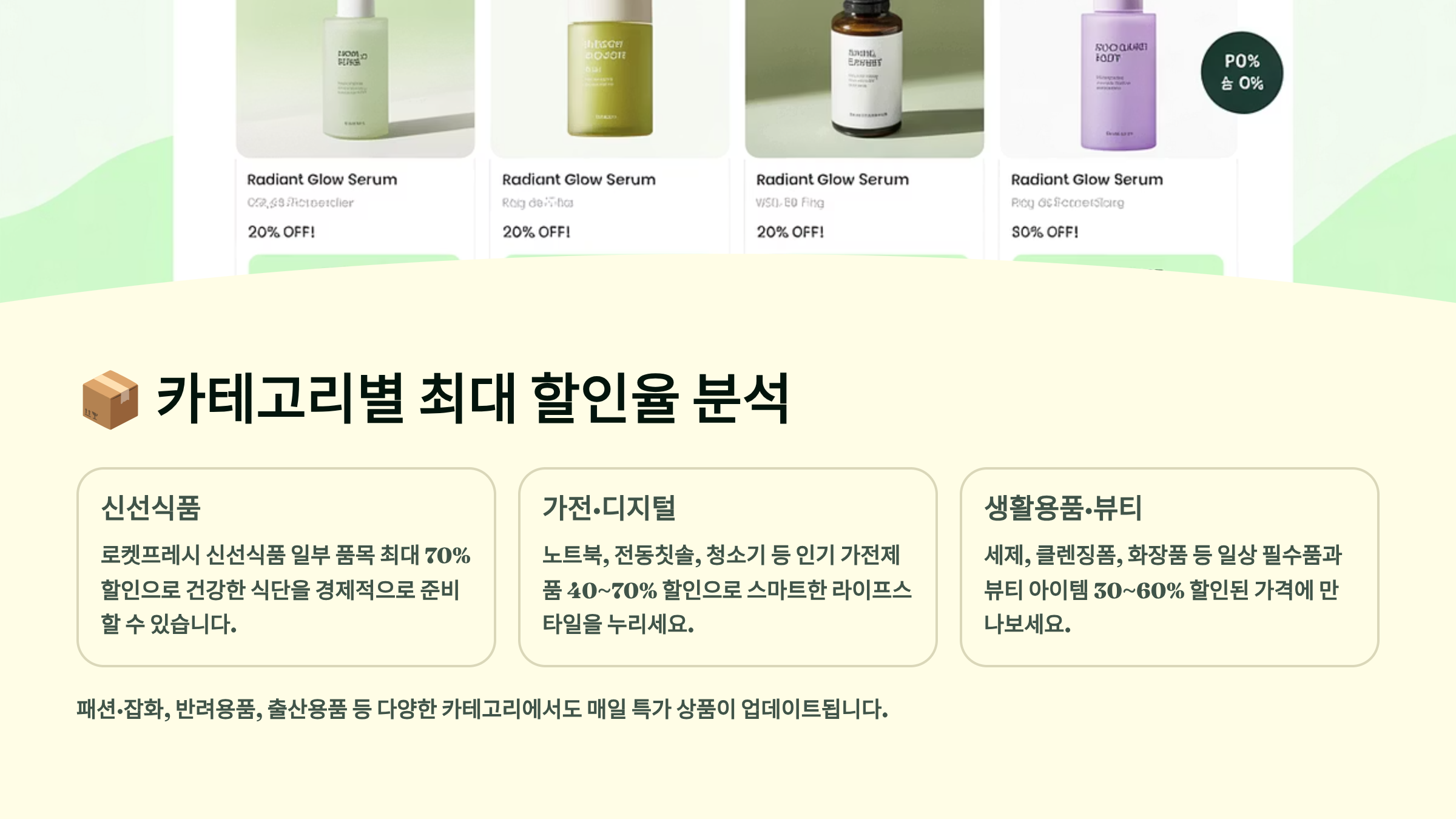 뷰티 카테고리도 여름 시즌 특가가 많아요. 선크림, 쿨링 스프레이, 워터프루프 메이크업 제품들이 1+1, 2+1 행사를 많이 하고 있어요. 기초 화장품도 세트 구성으로 구매하면 단품보다 훨씬 저렴해요. 특히 와우회원 전용 뷰티 박스나 럭키백 같은 특별 구성 상품들은 정가의 30% 가격으로 다양한 제품을 체험할 수 있어서 인기가 많답니다.